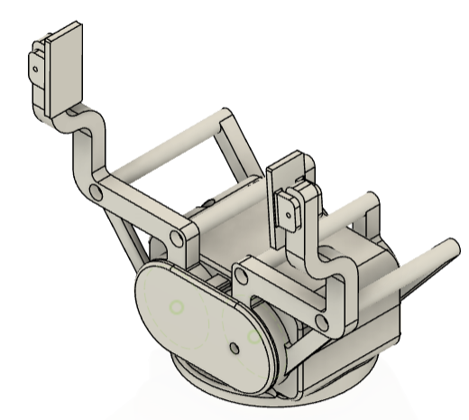 前回と同じように既存のハンドをベースにFusionでモデリングしました。軽量にするためできるだけ削りました。剛性が心配ですがとにかく作ってみます。軽量にするために隙間が生まれ、指を挟む危険性があるのでハンドの開閉角度を70度程度から30度程度にして挟まれにくくしました。Fusionの操作に慣れてきたこともあって前回よりも早くモデリングできました。