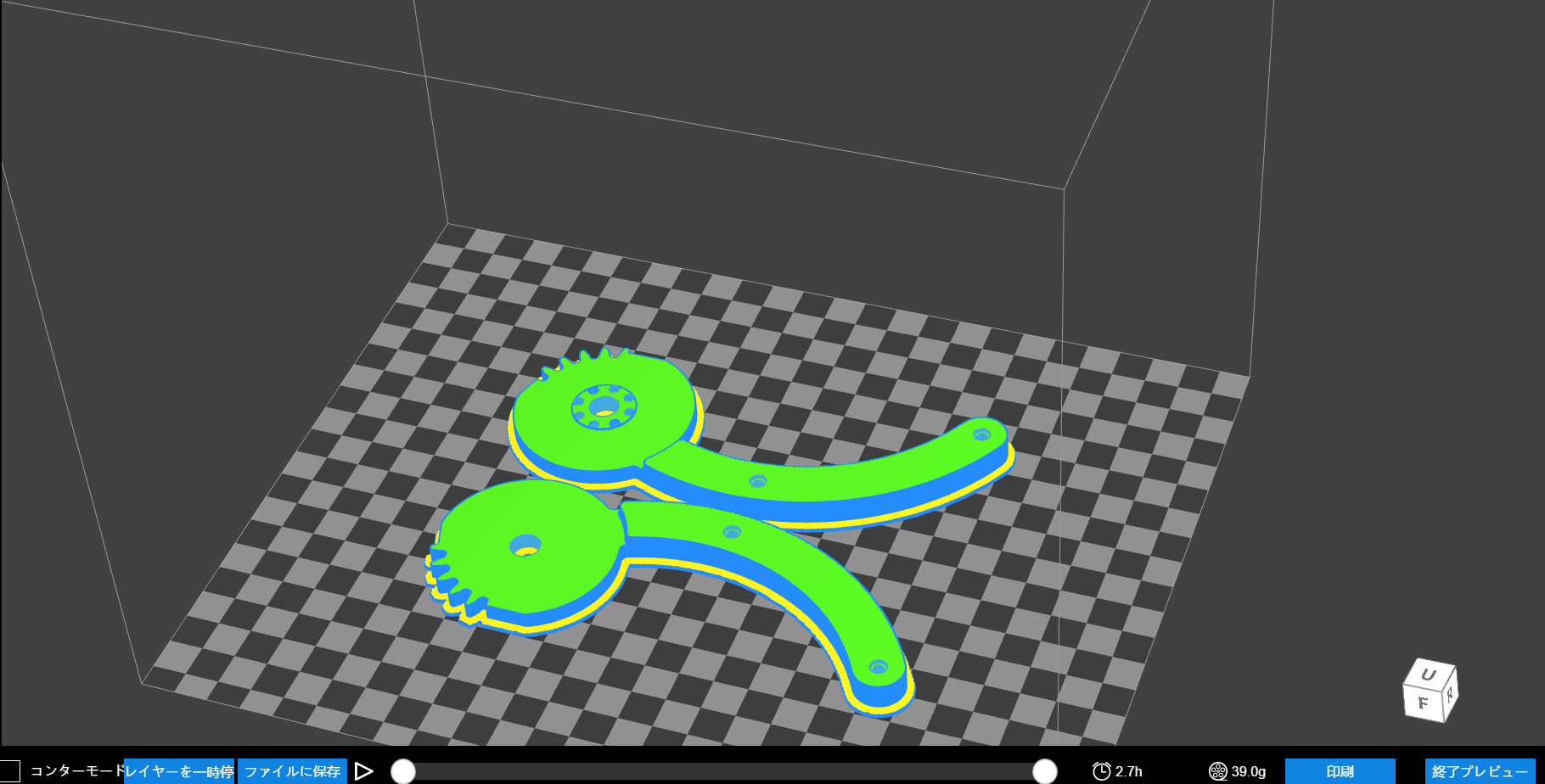 歯車を印刷するときはできるだけ密度を上げたほうが破損しにくくなるのですが、今回は時短のためと、大きな負荷がハンドにかかった時に歯車が一番最初に壊れるように、密度を通常と同じ20%にしました。歯車の周りにはカバーを設けているので、歯車が最初に壊れれば破損した部品が飛んでいくことを防げ、安全だと思いこのようにしました。