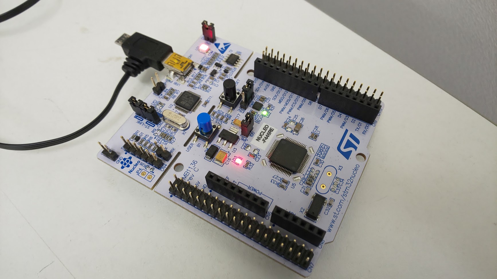 Nucleoボードを見ると、LD2の緑LEDの点滅周期が変わっていることがわかります。