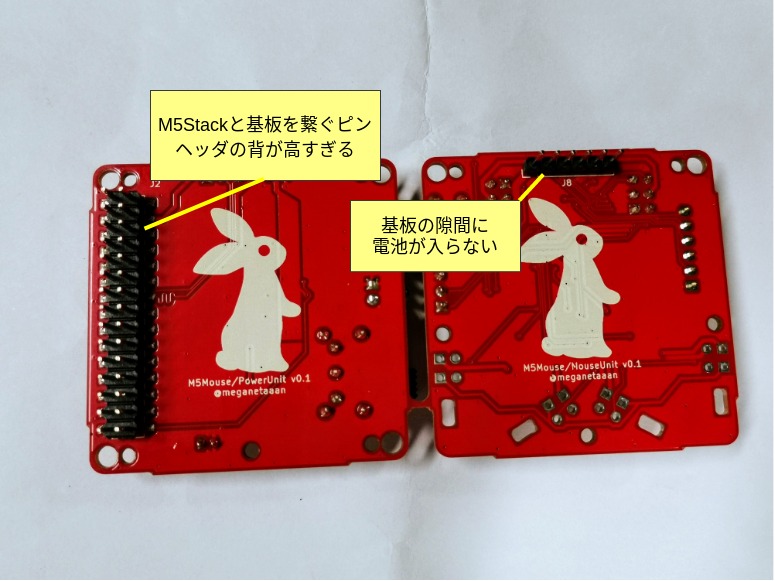 M5Mouseはマイコン基板と電源基板の隙間に電池を収める設計でしたが、DCDC等の部品の高さを考慮していなかったために基板の隙間に電池が入りきらなくなってしまいました。