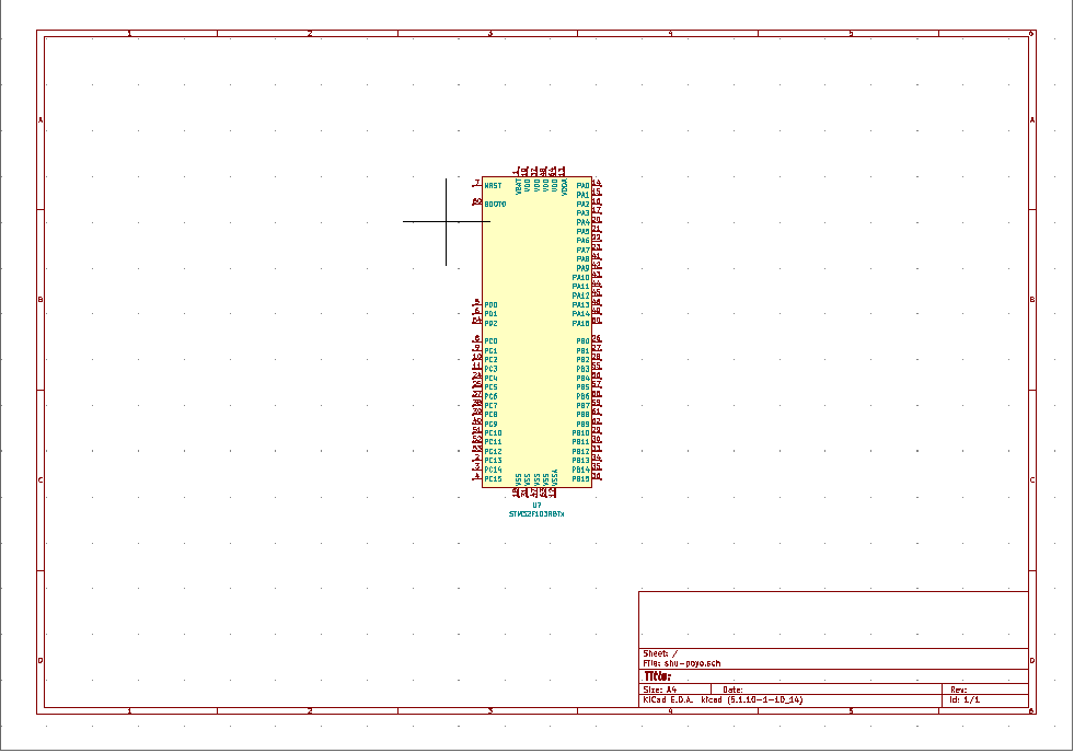 すると次のような画面が表示されます。ここから、抵抗やコンデンサーなどを見つけて配置していきます。さて、まずはSTM32F103RBを配置しますが、見つけるのが大変なので検索欄を使って探してみます。入力したときになかった場合は、別途入手する必要があります。STM32F1シリーズはこちらからダウンロードできます。(なお、新規ライブラリの追加に関してはこちらのブログを参考にしてください)