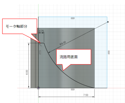 羽に垂直な面にスケッチを描き始めます。まずは底面になる部分を描きます。今回は空気の流路を考えて円弧上に底面になる部分と中心のモータ軸になる部分を作成します。