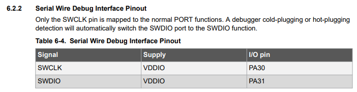 外部リセットピンをデバッガーに接続しますが、MPLAB SnapのマニュアルのSWD接続にはMCLRと書かれていました。Master Clear Pin External Reset (MCLR)はMicrochip?PIC?っぽい書き方なんでしょうか。ここをSAMマイコンのリセットピンにつないであげると書き込み時にMPLAB X IDEからリセット信号を送ってくれそうです。