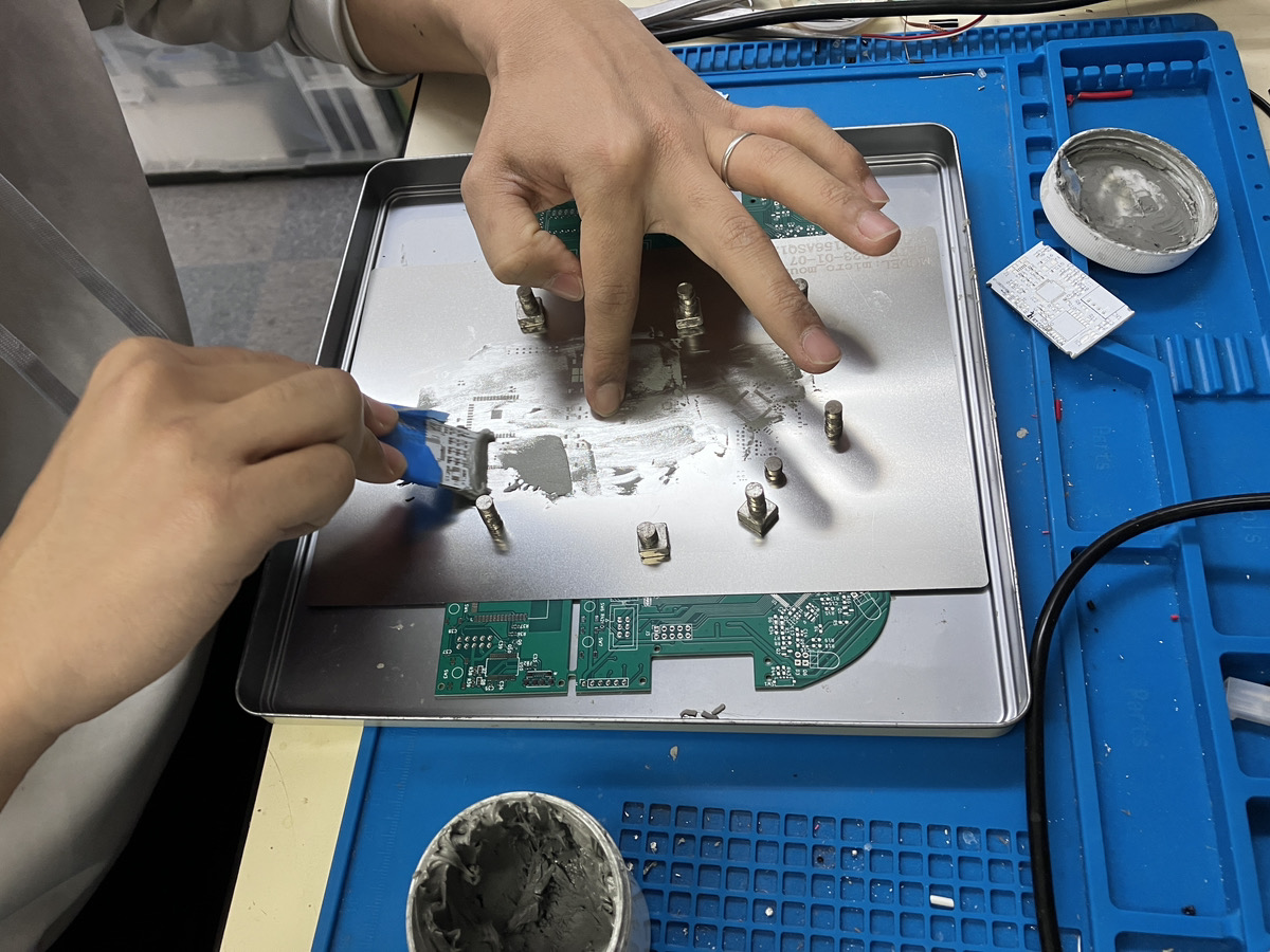 基板を温めることで先程塗った半田ペーストを溶かし、部品のはんだ付けを行います。