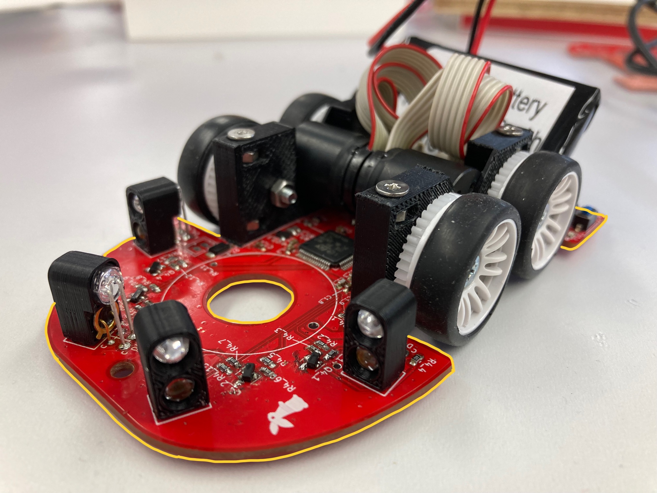 4輪なので少し占有する領域が多いです。機体がコースに激突した際にモータのシャフトにダメージが行かないようにタイヤが車体の内側に収まるようにします。