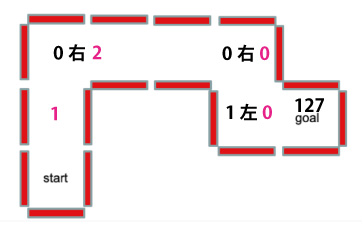 右ターンをする時は0、左ターンは1になります。それと直進する区画の数、最後に127で終わり。