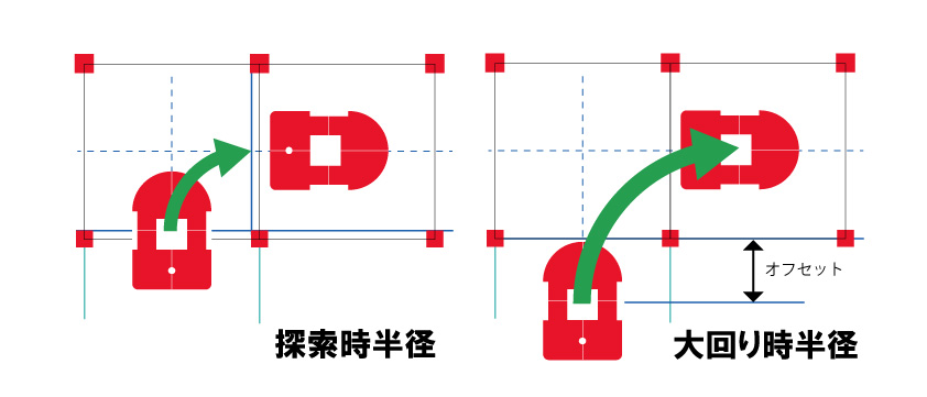 単純に半径を大きくすればよいのでは?と思ったけれど、そう簡単な話ではなく…旋回半径を大きくすると1区画からはみ出てしまうので、回り切れる直進するスペースが必要。