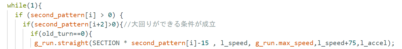 straight関数のところでl_speedとなるのがl_accelになっている個所が見つかり、ここかぁああ!と直します。これだと加速するはずのところでガクッと減速、そのあとまた加速になるのですんなりと動いてくれなかったようです。
