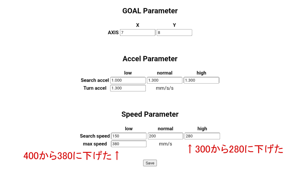 何だろう、早すぎるか?加速度が高すぎるか?と思いつつも試走会の時間切れ、宿に入って4×4の迷路で試してみても問題ないし、大きな迷路じゃないとわからない…。どうする、悩むぅううう!